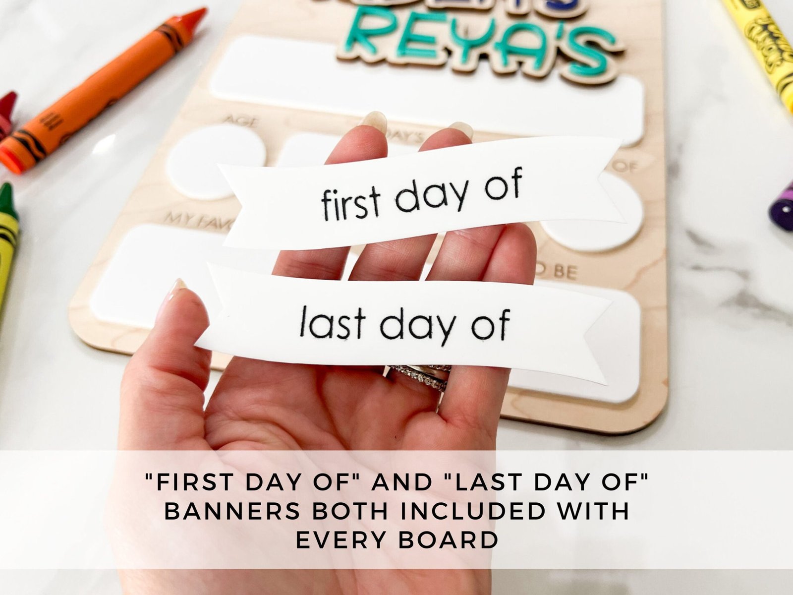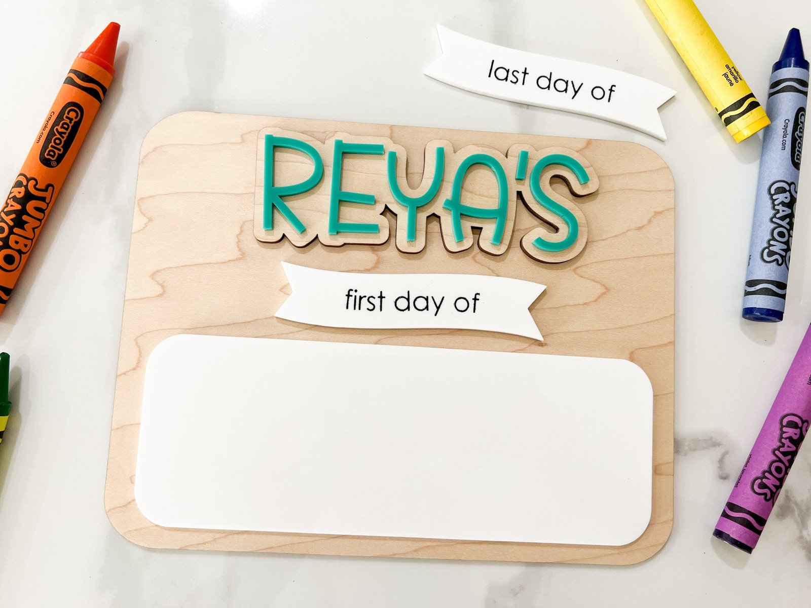 Each board comes with interchangeable headers: “First Day Of” and “Last Day Of”, letting you use it twice a year without buying a new sign.
